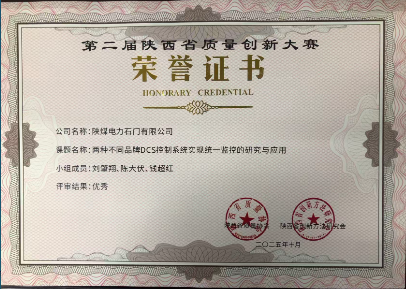 陜煤石電:《兩種不同品牌DCS控制系統(tǒng)實現(xiàn)統(tǒng)一監(jiān)控的研究與應用》獲陜西省質(zhì)量創(chuàng)新大賽優(yōu)秀獎